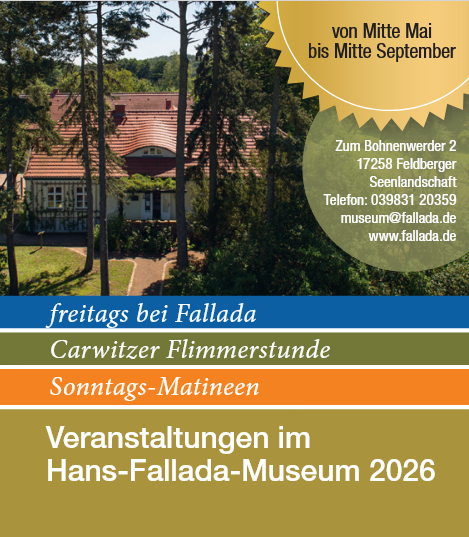 Seit 25 Jahren betreibt die Hans-Fallada-Gesellschaft e. V. das Hans-Fallada-Museum in seiner heutigen Gestalt mit einem breiten Angebot an Führungen, Literarischen Spaziergängen und Lesungen. Aber nicht nur das: freitags bei fallada, die Hans-Fallada-Tage, neuerdings die Sonntags-Harfen-Matineen und die Carwitzer Flimmerstunden sind Veranstaltungen, die dem Ort eine besondere Note von Lebendigkeit, Austausch, Freude und Nachdenklichkeit verleihen.